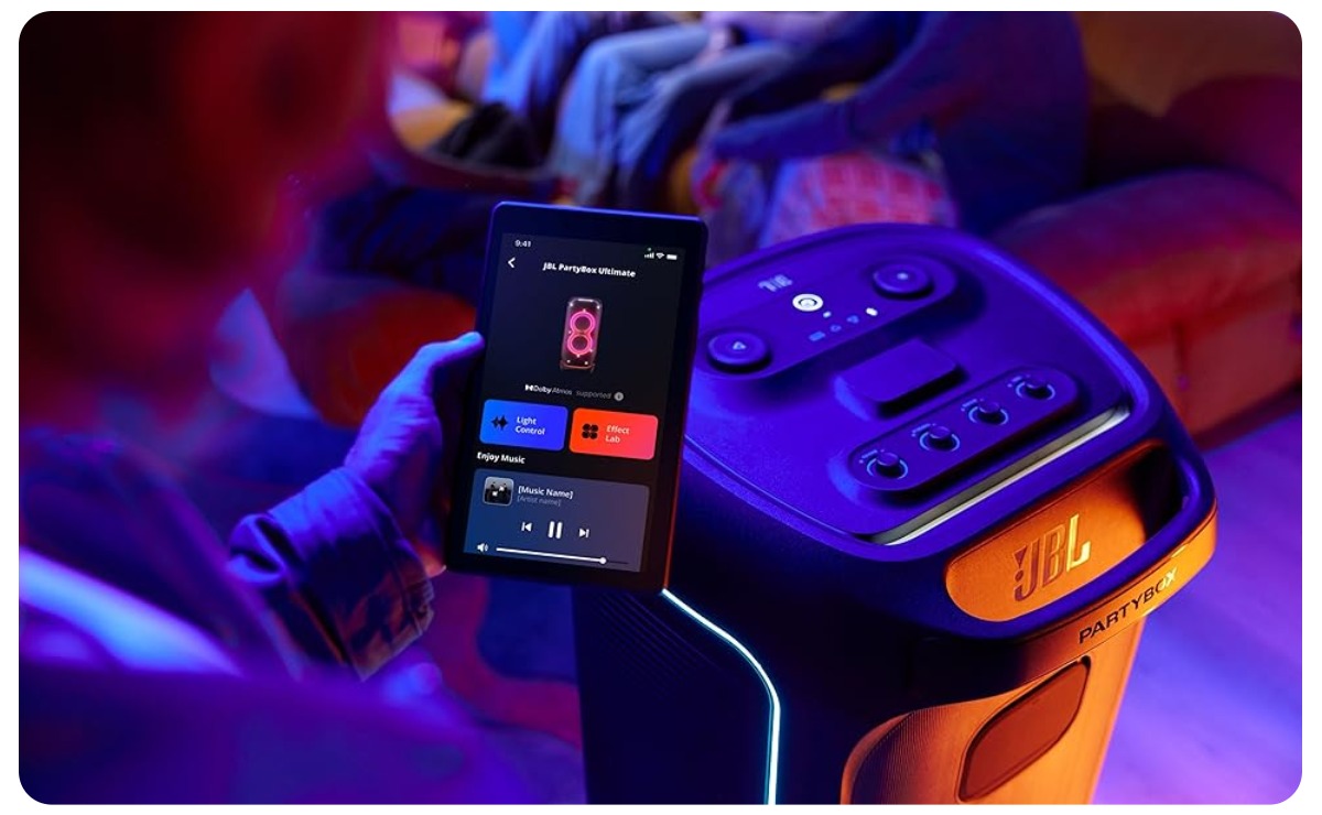 В приложении JBL PartyBox App можно настраивать световые эффекты, активировать режим караоке, регулировать эквалайзер и подключать дополнительные колонки.
