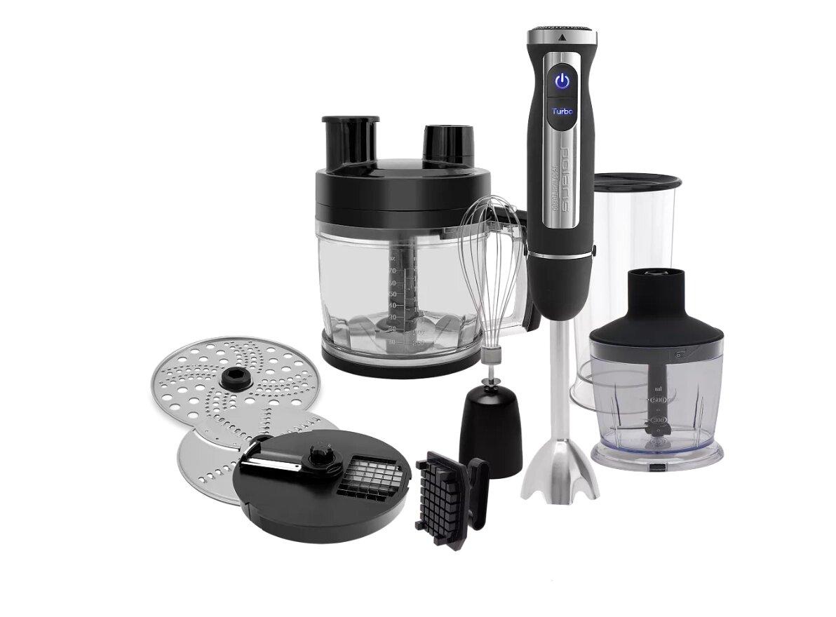 Обзор погружного блендера Polaris PHB 1583L Silent с технологией 4 PRO TITANПогружной блендер Polaris PHB 1583L Silent — это многофункциональный и мощный прибор, который станет незаменимым помощником на вашей кухне. Он сочетает в себе современные технологии и удобство использования.Основные характеристикиМощность: 1500 ВтНожи 4 PRO TITAN: С титановым покрытием, которые работают в 2 раза эффективнее и сохраняют прочность и остроту на долгие годы.Технология PROtect+: Двойная защита двигателя от перегрева и перегрузки, что обеспечивает надежность и долговечность.МногофункциональностьФункции 7 в 1:БлендерМиксерНасадка для резки кубикамиИзмельчитель (объем 0,5 л и 2 л)Терка для драниковДиск для нарезки ломтиками/шинковкиСкорости: 30 скоростей с плавной регулировкой для точного выбора нужного режима.Режим ТУРБО: Для быстрого смешивания и обработки продуктов.Удобство использованияНизкий уровень шума: Обеспечивает комфортное использование без лишнего шума.Материалы: Насадка блендера и венчик из нержавеющей стали для долговечности.Комплектация:Чаша измельчителя объемом 2 лЧаша измельчителя объемом 0,5 лМерный стакан с крышкой (объем 0,6 л)Диск-мелкая теркаСпециальное приспособление для быстрой и легкой очисткиПреимуществаУдобен в применении и очистке, что делает его идеальным выбором для любой кухни.С блендером Polaris PHB 1583L Silent вы сможете легко и быстро готовить разнообразные блюда, наслаждаясь процессом приготовления!