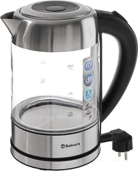 Доставка по Беларуси!Рассрочка!- Тип: электрочайник- Материал корпуса: металл, пластик, стекло- Материал колбы: стекло- Мощность: 2200 Вт — Объем: 1.7 л- Цвет корпуса: нержавеющая сталь, черный- Минимальный уровень воды: 0.5 л- Подставка с возможностью вращения (на 360°)- Внешний уровень воды по бокам- Подсветка воды — Нагревательный элемент: закрытый- Управление: механическое* Производитель: ООО «Сакура Электроникс Групп». 630501 Российская Федерация, Новосибирская область, р.п.Краснообск, д. 221.
