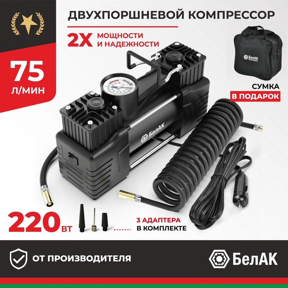 Компрессор автомобильный двухпоршневой Мистраль 75 12V разработан российским производителем БелАК, награждённым девятью национальными премиями «Автокомпонент года». Насос из серии «Мистраль» обладает повышенной мощностью и увеличенными щетками электромотора. Автокомпрессор 12v Мистраль-75 имеет производительность — 75 л/мин(220 вт).В компрессор воздушный установлен мощный двухпоршневой двигатель. Манометр на корпусе удобно использовать и контролировать давление при накачке шин машины. Компрессор Мистраль- 75 (75л/мин) работает с напряжением 12 вольт от прикуривателя. Для работы компрессора рекомендуем использовать розетки прикуривателя с предохранителями 20 АМПЕР или переходник с прикуривателя на клеммы аккумулятора. Предохранитель защищает мотор от повреждения. Шланг высокого давления для компрессора изготовлен из морозоустойчивой резины. Насос автомобильный для накачки колес имеет металлический корпус.Также в комплект входит сумка — чехол для того, чтобы ваш компрессор всегда оставался целым и не те