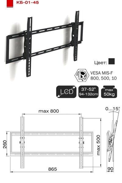 * Диагональ ТВ: 37-52»* Максимальная нагрузка: 50 кг* Максимальный диаметр крепежных отверстий: 10 мм* Максимальное расстояние между крепежными отверстиями: — по горизонтали 800 мм- по вертикали 500 мм* Угол наклона: до 15о* Расстояние от стены: 90 мм * Производитель: ПТЧУП «Электриклайт»* Завод-изготовитель: 220093, г. Минск, ул. 1-ая Радиаторная, 52* Импортер : ПТЧУП «Электриклайт», 220093, г. Минск, ул. 1-ая Радиаторная, 52* Сервисный центр: ПТЧУП «Электриклайт», 220093, г. Минск, ул. 1-ая Радиаторная, 52* Гарантийный срок: 2 года* Срок службы: не установлен