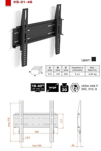 * Диагональ ТВ: 19-40»* Максимальная нагрузка: 30 кг* Максимальный диаметр крепежных отверстий: 6 мм* Максимальное расстояние между крепежными отверстиями: — по горизонтали 300 мм- по вертикали 310 мм* Расстояние от стены: 30 мм* Производитель: ПТЧУП «Электриклайт»* Завод-изготовитель: 220093, г. Минск, ул. 1-ая Радиаторная, 52* Импортер : ПТЧУП «Электриклайт», 220093, г. Минск, ул. 1-ая Радиаторная, 52* Сервисный центр: ПТЧУП «Электриклайт», 220093, г. Минск, ул. 1-ая Радиаторная, 52* Гарантийный срок: 2 года* Срок службы: не установлен