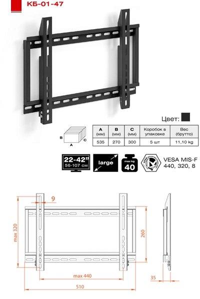 * Диагональ ТВ: 22-42»* Максимальная нагрузка: 40 кг* Максимальный диаметр крепежных отверстий: 8 мм* Максимальное расстояние между крепежными отверстиями: — по горизонтали 440 мм- по вертикали 320 мм* Расстояние от стены: 35 мм* Производитель: ПТЧУП «Электриклайт»* Завод-изготовитель: 220093, г. Минск, ул. 1-ая Радиаторная, 52* Импортер : ПТЧУП «Электриклайт», 220093, г. Минск, ул. 1-ая Радиаторная, 52* Сервисный центр: ПТЧУП «Электриклайт», 220093, г. Минск, ул. 1-ая Радиаторная, 52* Гарантийный срок: 2 года* Срок службы: не установлен