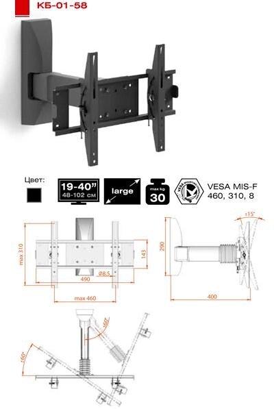 * Диагональ ТВ: 19-40»* Максимальная нагрузка: 30 кг* Максимальный диаметр крепежных отверстий: 8 мм* Максимальное расстояние между крепежными отверстиями: — по горизонтали 460 мм- по вертикали 310 мм* Угол наклона: до 15о* Поворотное колено: 60о* Расстояние от стены: 400 мм* Производитель: ПТЧУП «Электриклайт»* Завод-изготовитель: 220093, г. Минск, ул. 1-ая Радиаторная, 52* Импортер : ПТЧУП «Электриклайт», 220093, г. Минск, ул. 1-ая Радиаторная, 52* Сервисный центр: ПТЧУП «Электриклайт», 220093, г. Минск, ул. 1-ая Радиаторная, 52* Гарантийный срок: 2 года* Срок службы: не установлен