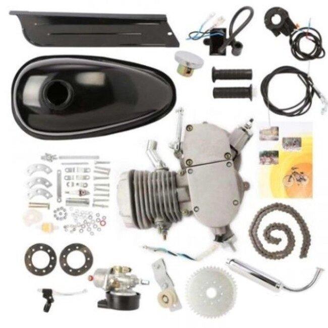 В комплект входят: 2-х тактный двигатель объемом 80 куб.см., карбюратор, катушка зажигания CDI, ручка газа для установки на руль, трос дроссельной заслонки, трос сцепления, аварийная кнопка выключения двигателя, рычаг сцепления, цепи, защитная крышка цепи, 44T-звездочка с 9 отверстиями, натяжитель цепи, топливный бак, топливный фильтр, бензиновый топлипровод, спускной кран, глушитель, комплект болтов.