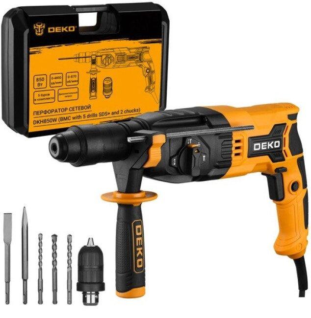 ДОСТАВКА ПО БЕЛАРУСИ!РАССРОЧКА, КРЕДИТ! — Режимы работы: сверление, сверление с ударом, долбление- Питание: сеть- Мощность: 850 Вт- Патрон: SDS-plus- Максимальная скорость вращения: 870 об/мин- Частота ударов: 4 850 ударов/мин- Энергия удара: 3 Дж- Длина кабеля: 2.5 м- Максимальный диаметр сверления, бетон: 22 мм- Максимальный диаметр сверления, металл: 13 мм- Максимальный диаметр сверления, дерево: 30 мм- Реверс- Дополнительная рукоятка — Предохранительная муфта — Фиксация кнопки включения — Ограничитель глубины сверления — Сверла: 3 (по бетону)- Оснастка и инструмент в комплекте: быстрозажимной патрон, зубило (пика)- Комплект поставки: * Перфоратор;* Глубиномер;* Угольные щетки — 2 шт;* Долото плоское;* Долото острое;* Бур — 3 шт;* Быстрозажимной патрон;* Руководство по эксплуатации;* Кейс.* Производитель: Деко Тулс, 1 Хэдкватер, 555 Рили Роуд, Иньчжоу, Нинбо, Чжэцзян, Китай* Завод-изготовитель: Китай, CBD of Yinzhou District, Ningbo City, Zhejiang Province* Импортер: ООО «Надежные инструменты», 220140, г. Минск, ул. Притыцкого д. 62, корпус 12, комната 203* Сервисный центр: Технозу ООО, г. Минск, ул. Притыцкого 62/5* Гарантийный срок: 1 год* Срок службы: не установлен