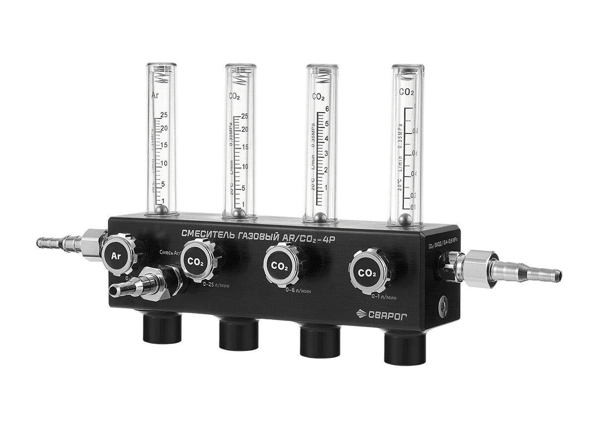 ul.customprod li{list-style-type:disc;padding-left:5px;}ul.customprod li:before{content:» «}Смеситель газовый AR/CO2-4Р предназначен для получения защитной смеси стабильного состава из аргона и углекислого газа. Регулировка смешения газов производится вручную.Применяется для TIG и MIG сварки совместно с баллонными редукторами или регуляторами расхода газа. Рекомендуется использовать для сварки тонких металлов: алюминия, титана, нержавеющей и листовой стали.Четыре ротаметр-колбы для аргона ( с расходом 0–25 л/мин.) и углекислого газа (с расходом 0–1 л/мин. , 0–6 л/мин. и 0–25 л/мин.) дают более широкий диапазон настроек смесителя для получения максимально точной в процентном соотношении смеси.Функциональные преимущества газового смесителя AR/CO2:Экономичность — позволяет настроить процентное соотношение расхода аргона и углекислого газа под конкретную задачу, что исключает необходимость закупать и хранить баллоны с готовыми смесямиМобильность — легко транспортируется на любой производственный участок, легко устанавливается и не требует электропитанияУниверсальность — регулировка расхода газа и состава смеси происходит бесступенчато с помощью вентилей, расположенных на корпусе смесителяНадежность — защищает подключенную систему от избыточного давления и независим от колебаний давления и расходаКонструктивные особенности газового смесителя AR/CO2. Смеситель состоит из:
