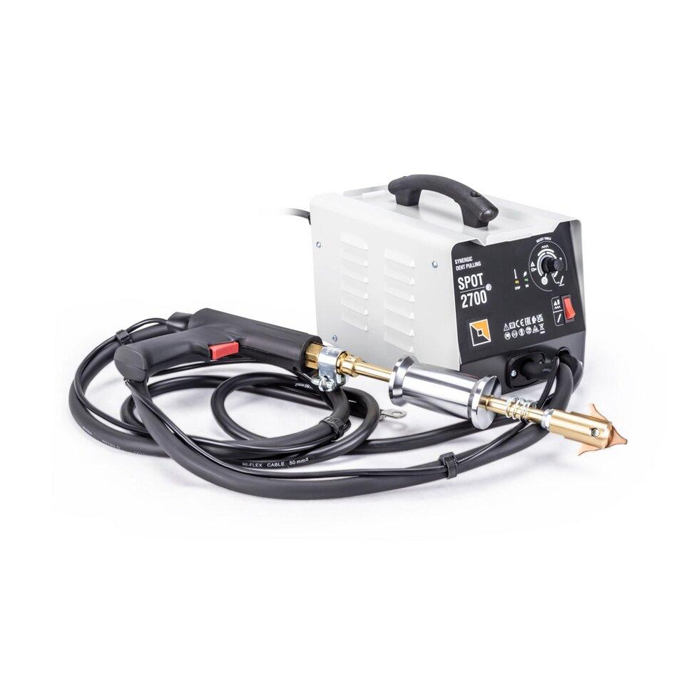 ul.customprod li{list-style-type:disc;padding-left:5px;}ul.customprod li:before{content:» «}Споттер FoxWeld SPOT 2700 – аппарат для точечной контактной сварки, который применяется при восстановлении геометрии кузовных панелей автотранспортных средств, а также при ремонте стальных тонкостенных элементов. Данный аппарат предназначен для осуществления следующих кузовных работ: рихтование; сварка гвоздиков, заклёпок, кружков и шпилек для накладок; удаление выемок; выравнивание поверхности, устранение вмятин. Аппарат не предназначен для сборки металлических деталей. В качестве источника питания используется бытовая сеть переменного тока 230 В. Использование меди для обмотки силовой катушки трансформатора позволило увеличить силу тока сварки до 2600 А. Этот фактор в сочетании с сетевым предохранителем, увеличивает надежность агрегата.Преимущества:Простота управленияНебольшие габариты и весИндикация рабочих процессов и неисправностей